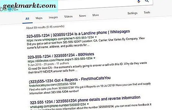 Vi kan använda världens största sökmotor för att söka efter oss, och det kan ofta returnera lite användbar information. Du har två huvudalternativ, du kan lägga in telefonnumret och utföra en sökning och se vad som händer. Du kan också söka efter "Reverse Phone Lookup", hitta en specifik webbplats och göra det så.