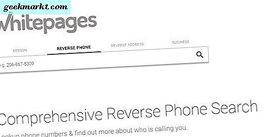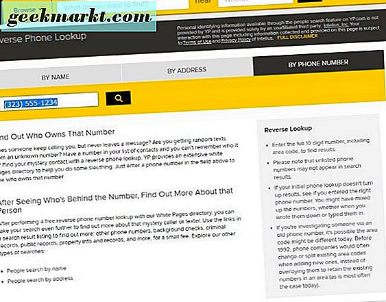 WhitePages.com är förmodligen den största leverantören av data på internet. Visserligen för USA-data ändå. En av de fria tjänsterna ger en omvänd telefonuppslag. Navigera till sidan, välj Reverse Phone Lookup från mitten, klistra in numret och tryck på Sök.
