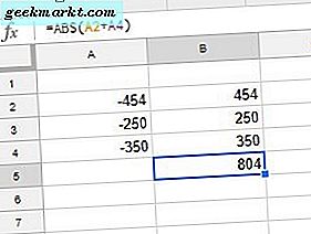 ABS beräknar också absoluta värden för valda celler. Välj till exempel B5, skriv '= ABS (A2 + A4)' i funktionsfältet och tryck på Retur. B5 returnerar absolutvärdet på 804. SUM-funktionen skulle returnera -804, men som ett absolut värde är resultatet 804.