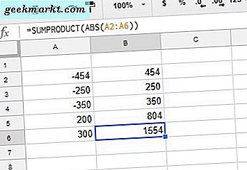 Innan du lägger till SUMPRODUCT-formuläret i kalkylbladet anger du '200' i cell A5 och '300' i A6. Ange sedan formeln '= SUMPRODUCT (ABS (A2: A6))' i cell B6 och tryck på Retur. B6 lägger nu till cellintervallet A2: A6 och returnerar ett absolut värde av 1.554.