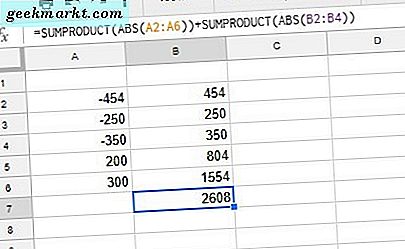 Du kan också expandera formeln så att den lägger till två eller flera cellintervall. Välj cell B7 i kalkylarket, och mata in '= SUMPRODUCT (ABS (A2: A6)) + SUMPRODUCT (ABS (B2: B4))' i funktionsfältet. Formeln kommer att lägga till siffrorna i intervallet A2: A6 och B2: B4 med absolutvärdet totalt 2.608.