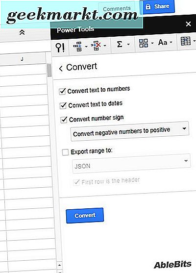 När du har installerat tillägget öppnar du kalkylarket och klickar på Add-ons > Verktyg . Välj Konvertera från undermenyn för att öppna Power Tools som i bilden nedan. Det öppnar alternativet Konvertera tillägget.